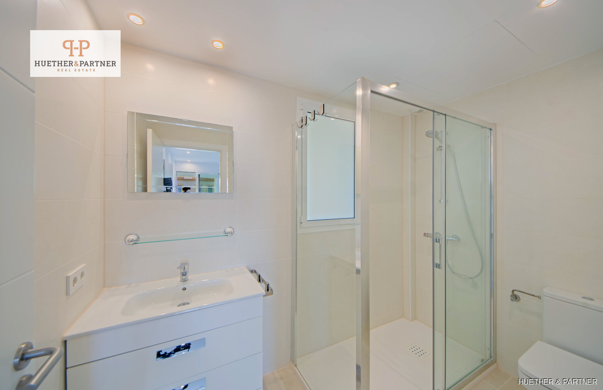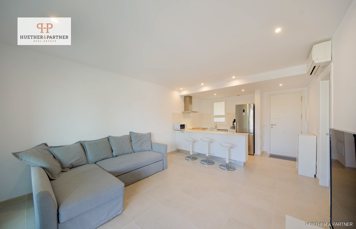 Diese modern eingerichtete 1-SZ-Wohnung in Porto Cristo bietet eine Wohnfläche von 64 m², die sich auf ein lichtdurchflutetes Wohnzimmer mit Essbereich, eine offene, voll ausgestattete Einbauküche und ein Schlafzimmer mit Einbauschrank und Bad en Suite verteilt. Die Wohnung ist hochwertig ausgestattet mit Doppel-Isolierverglasung, PVC-Fensterrahmen und Fensterläden, gefliesten Böden, einer Klima-Anlage warm/kalt sowie einer Sicherheits-Eingangstür.