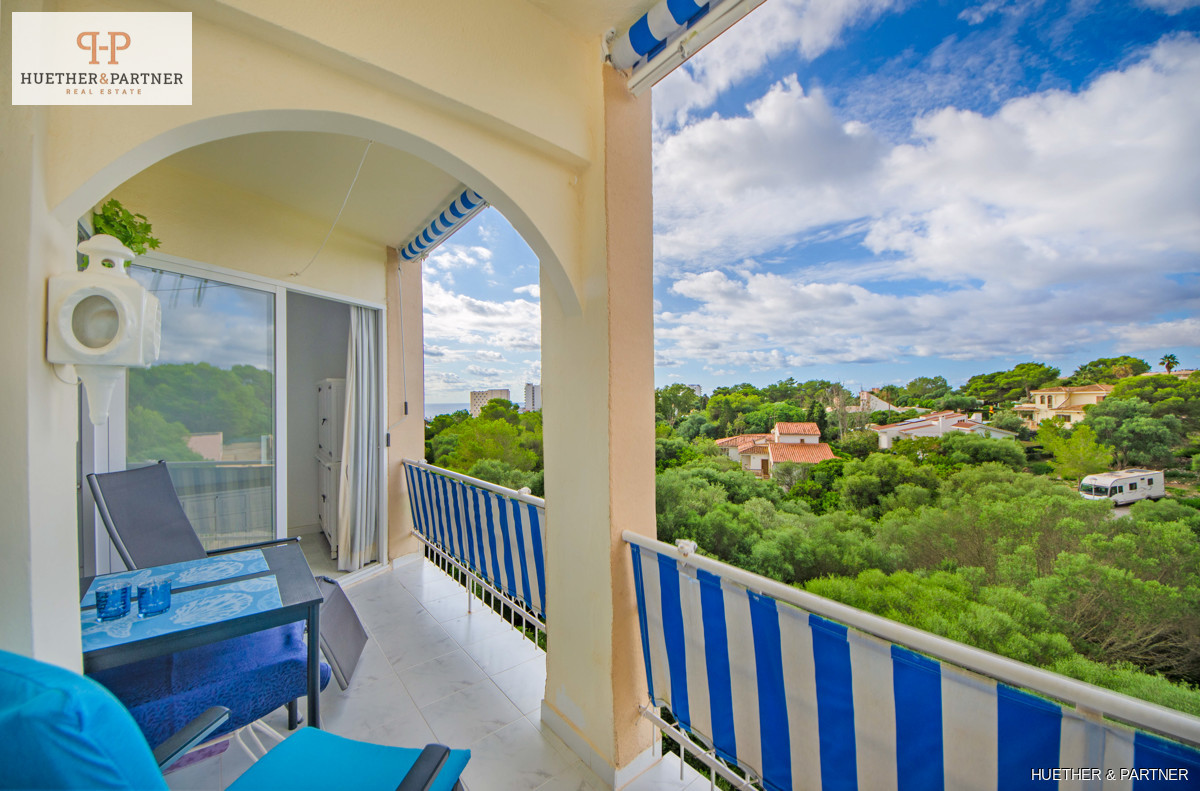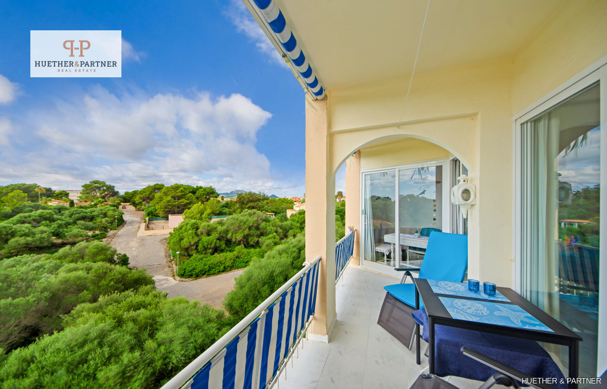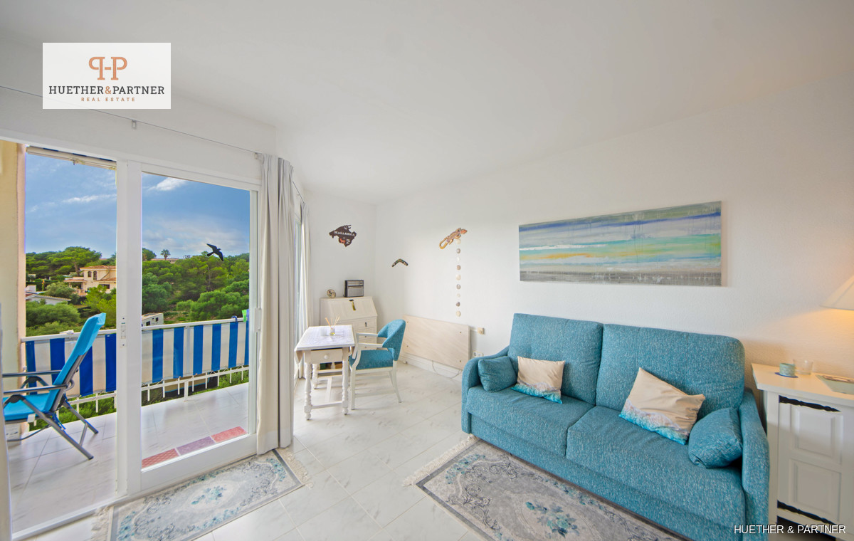 Diese lichtdurchflutete Balkon-Wohnung in Cales de Mallorca bietet einen atemberaubenden Meerblick. Sie besteht aus zwei zusammengelegten Studios und erstreckt sich über 60 m². Der Wohn-Essbereich verfügt über eine gemauerte Sitzecke, die bei Bedarf entfernt werden kann, sowie ein Schlafzimmer. Die Küche ist vollständig eingerichtet und das Badezimmer im mallorquinischen Stil gestaltet. Der großzügige Balkon lädt zum gemütlichen Beisammensein ein und bietet einen Blick über die Grünzone bis zum Meer.