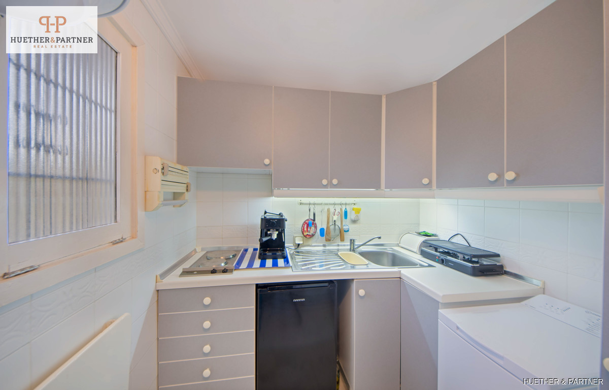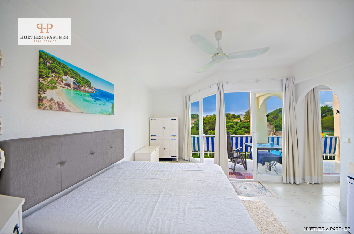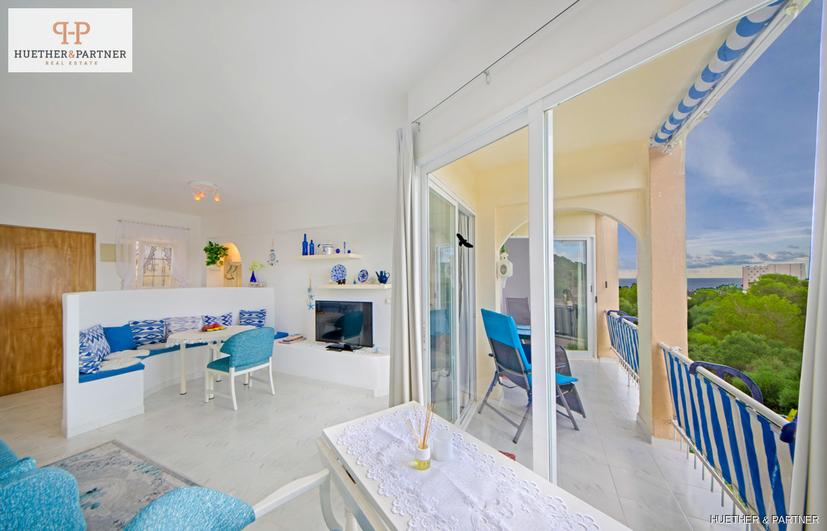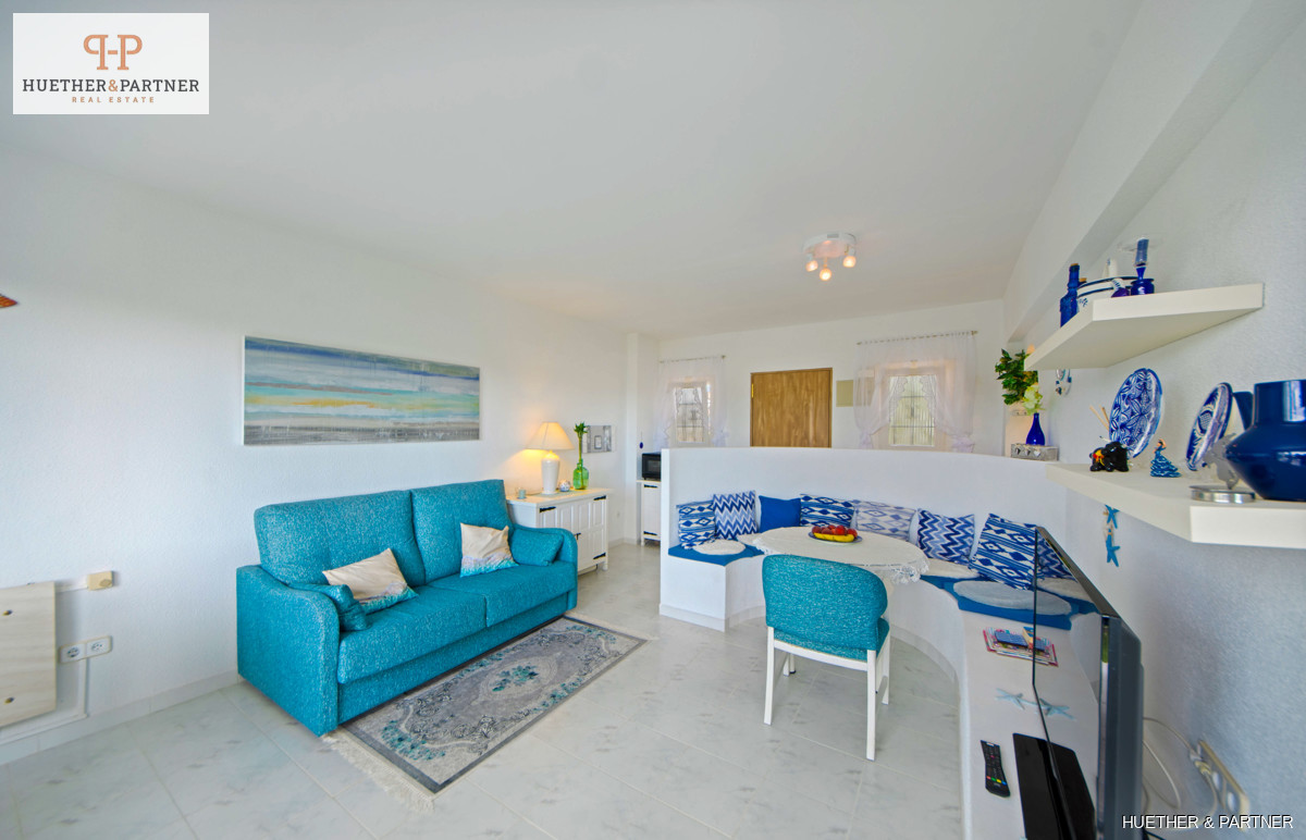 Diese lichtdurchflutete Balkon-Wohnung in Cales de Mallorca bietet einen atemberaubenden Meerblick. Sie besteht aus zwei zusammengelegten Studios und erstreckt sich über 60 m². Der Wohn-Essbereich verfügt über eine gemauerte Sitzecke, die bei Bedarf entfernt werden kann, sowie ein Schlafzimmer. Die Küche ist vollständig eingerichtet und das Badezimmer im mallorquinischen Stil gestaltet. Der großzügige Balkon lädt zum gemütlichen Beisammensein ein und bietet einen Blick über die Grünzone bis zum Meer.