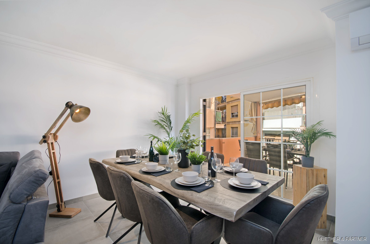 Diese stilvolle und komplett renovierte Wohnung befindet sich in der 3. Etage eines Wohnhauses in unmittelbarer Nähe zur Playa de Palma. Mit einer Wohnfläche von 127 m² bietet sie vier Schlafzimmer und zwei moderne Bäder, eines mit Dusche, das andere mit Badewanne. Die Wohnung beeindruckt durch hochwertige Materialien, eine elegante Einbauküche und ein besonderes Weinflaschenregal.