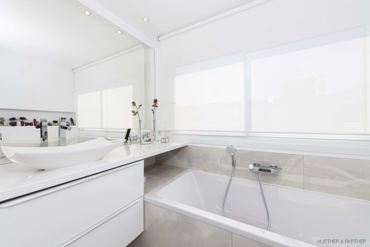 Die 90 m2 große Sonnenterrasse, zugänglich vom Wohnzimmer und Master Bedroom, lädt mit einem Jacuzzi zum Entspannen ein. Das Hauptbad bietet eine Badewanne mit Meerblick und das zweite Bad eine Regen-Glasdusche. Fußbodenheizung ist in beiden Bädern vorhanden. Ein Aufzug führt direkt zur Tiefgarage, wo ein Stellplatz zusätzlich erworben werden kann. Das Penthouse ist komplett renoviert, inklusive neuer Climalit-Fenster und Elektrik.