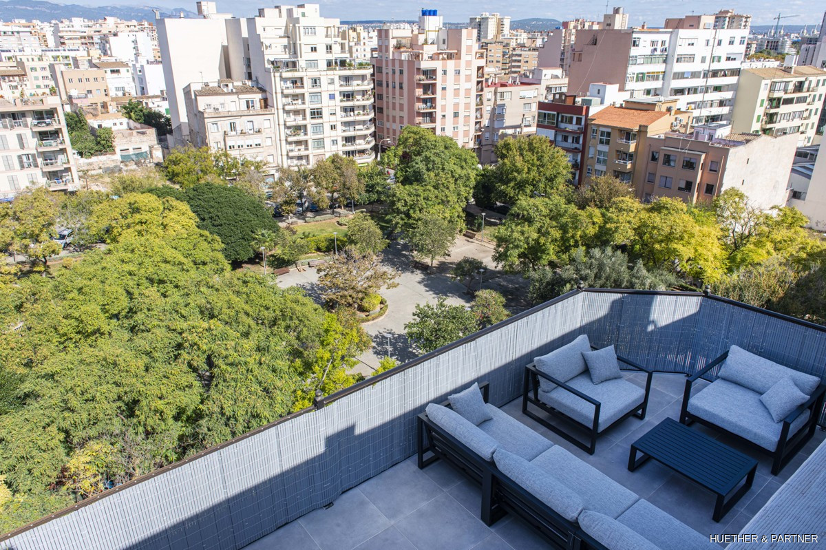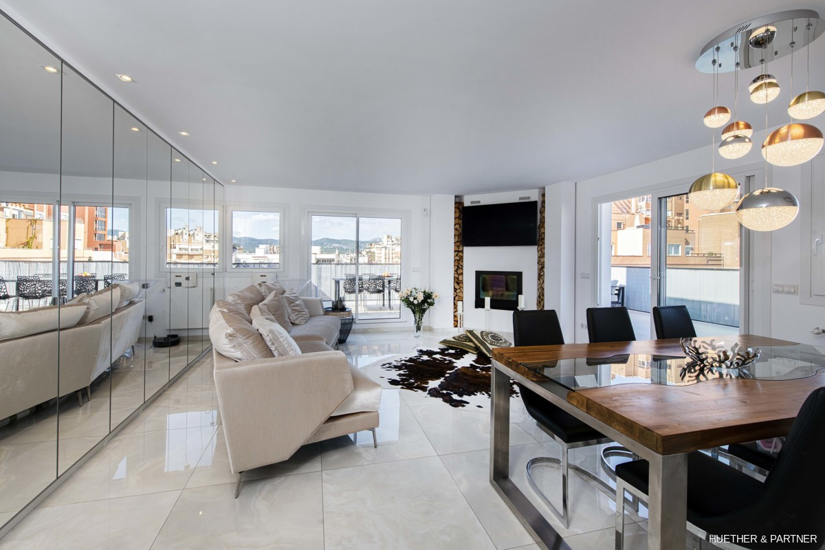 Dieses lichtdurchflutete Luxus-Penthouse in Palma bietet ein modernes Wohnerlebnis auf 145 m2 Wohnfläche. Es umfasst drei Schlafzimmer, zwei Bäder, einen Wohn-/Essbereich mit Kamin und eine amerikanische Küche mit Bosch-Einbaugeräten. Die Küche führt zu einem verglasten Balkon mit atemberaubendem Meerblick.