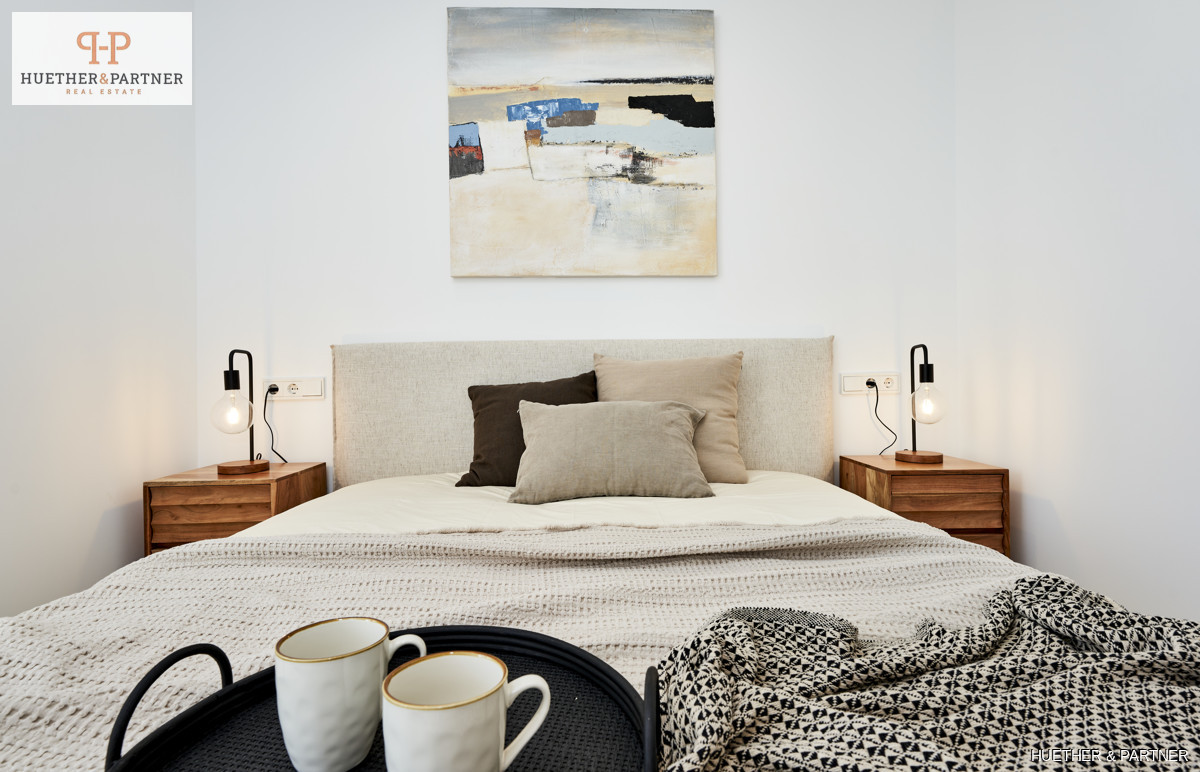 Zur Anlage gehört ein Gemeinschaftspool mit Dusche und Beleuchtung, ein Pkw-Stellplatz und ein privater Abstellraum. Der lichtdurchflutete Wohn-/Ess-/Küchenbereich führt direkt zur großzügigen Terrasse. Die beiden geschmackvollen Bäder und die Schlafzimmer mit Einbauschränken bieten höchsten Wohnkomfort. Fertigstellung ist für September 2025 geplant.