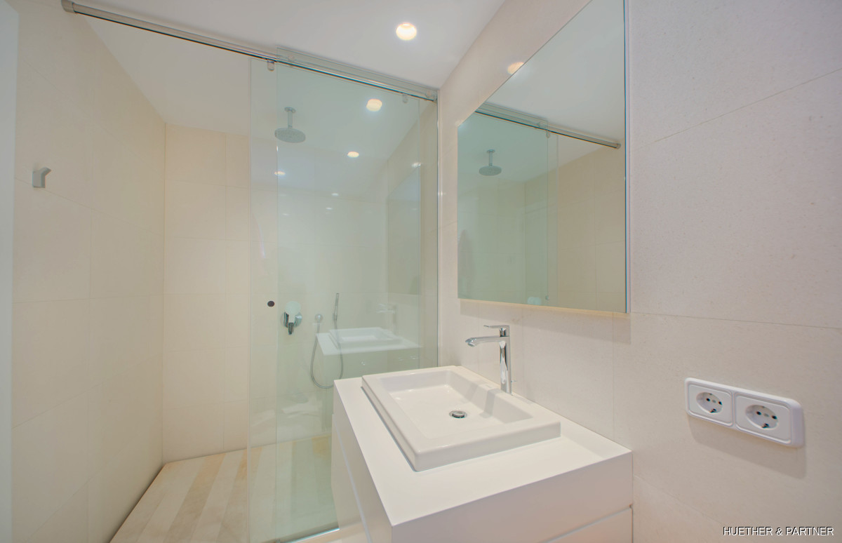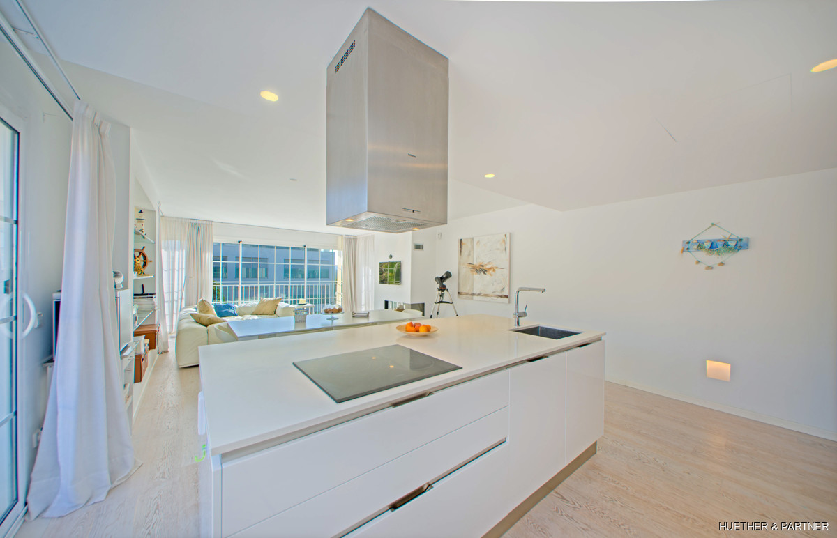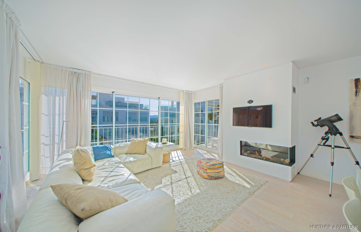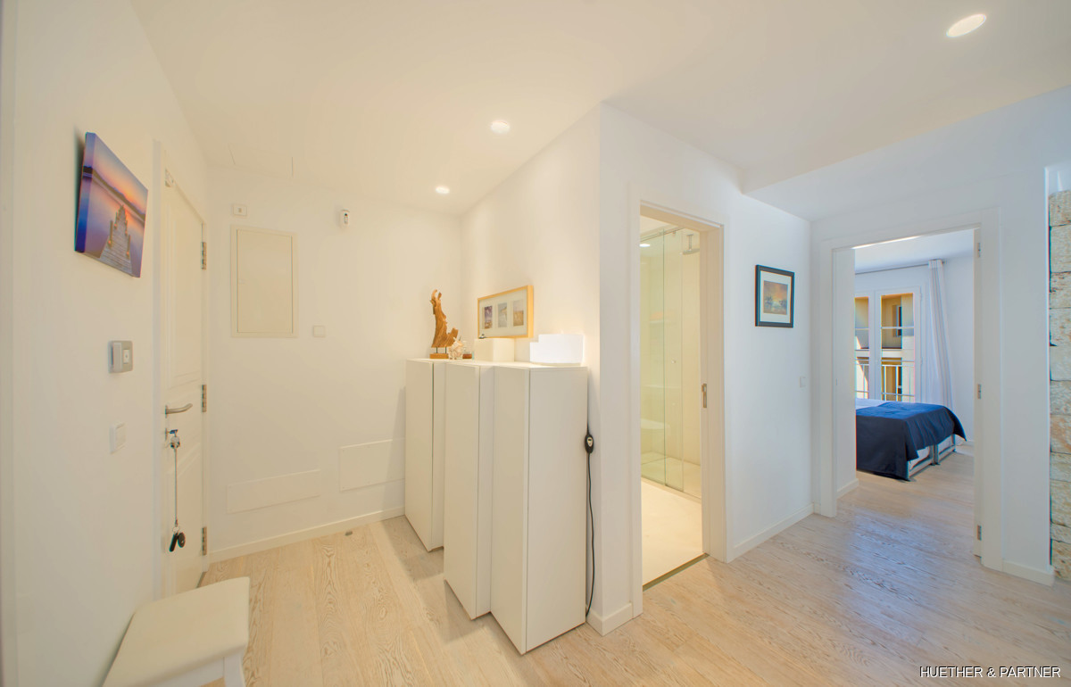 Dieses moderne Penthouse in Porto Cristo bietet luxuriöse Annehmlichkeiten und ein lichtdurchflutetes Ambiente. Die Wohnung verfügt über eine voll ausgestattete Venetta Cucine Küche mit Siemens-Geräten und einem stilvollen Wohnbereich mit Gaskamin. Von der Küche aus gelangt man auf einen Balkon, während eine Wendeltreppe zur privaten Dachterrasse führt. Das Hauptschlafzimmer beeindruckt mit einem offenen Badezimmer, freistehender Wanne und Einbauschrank.