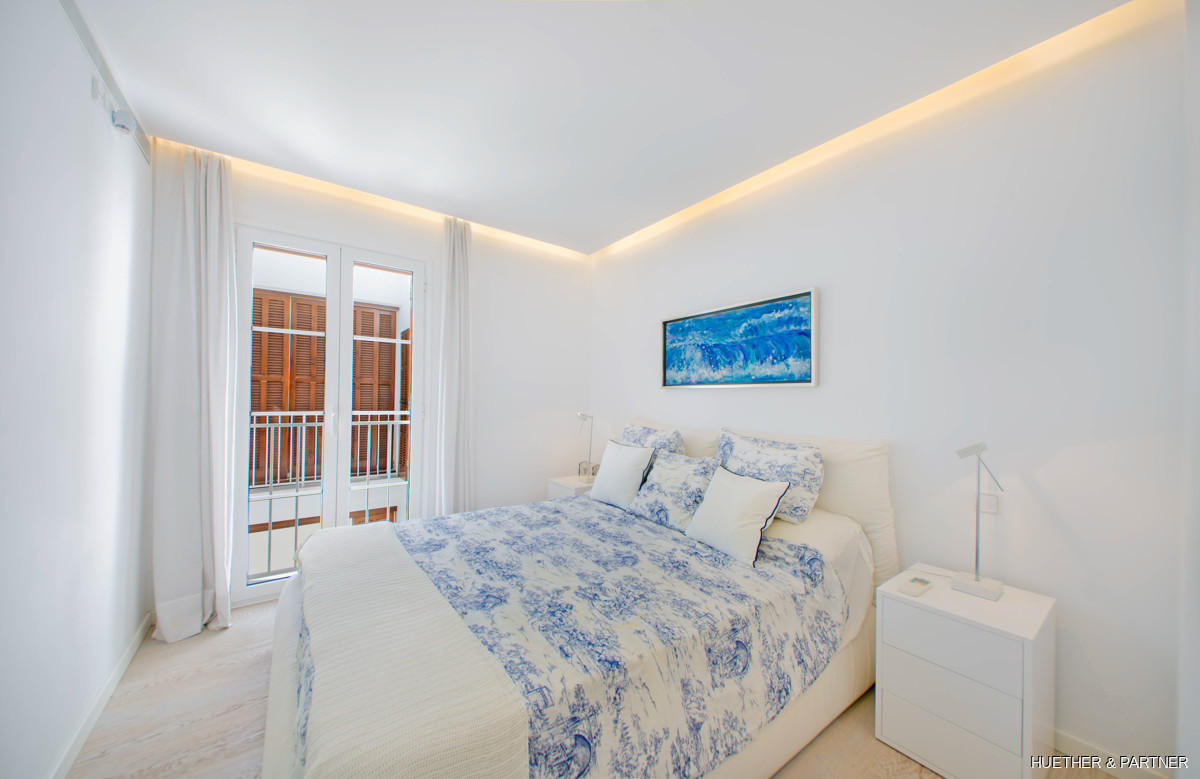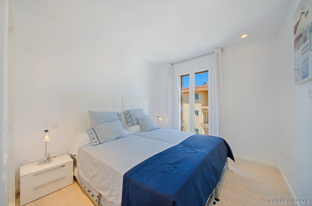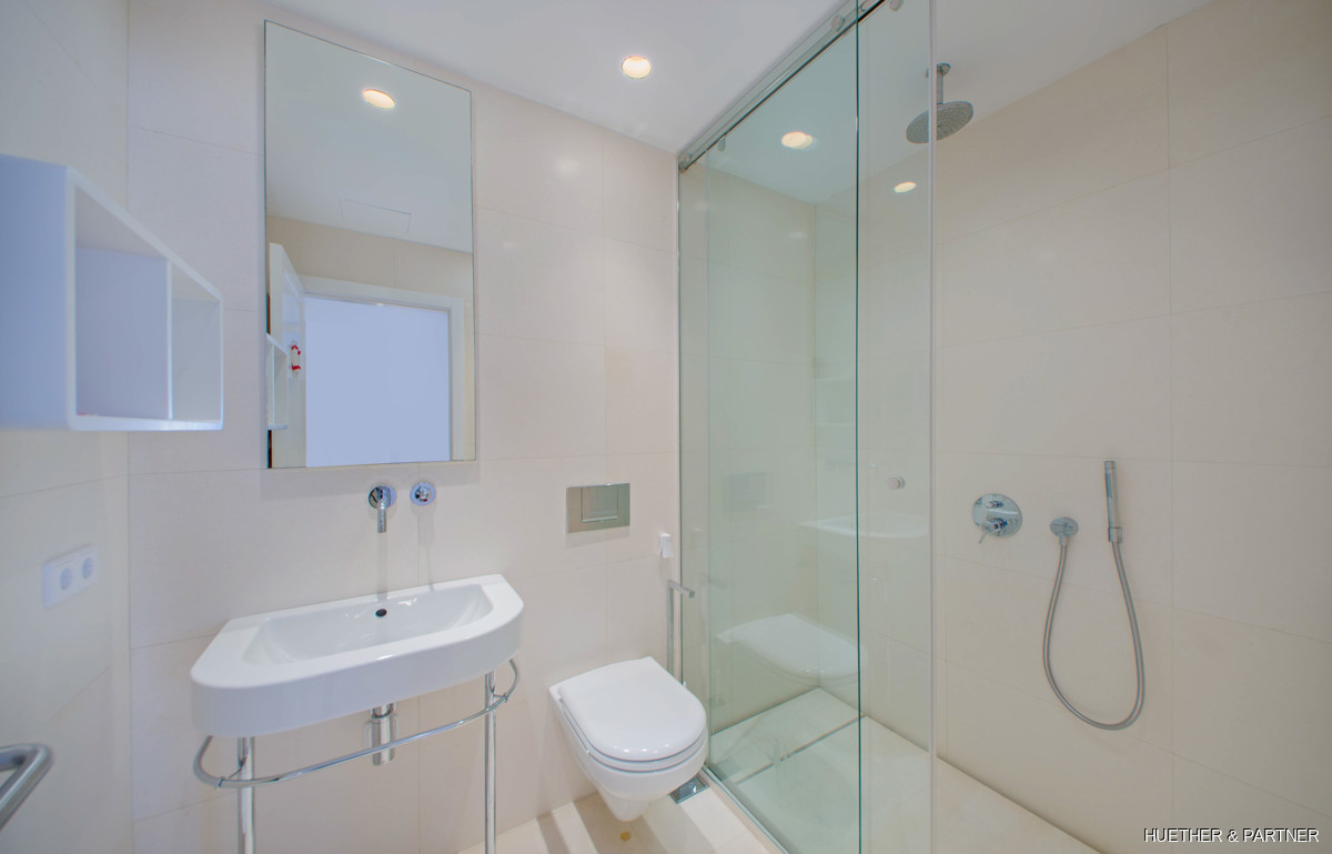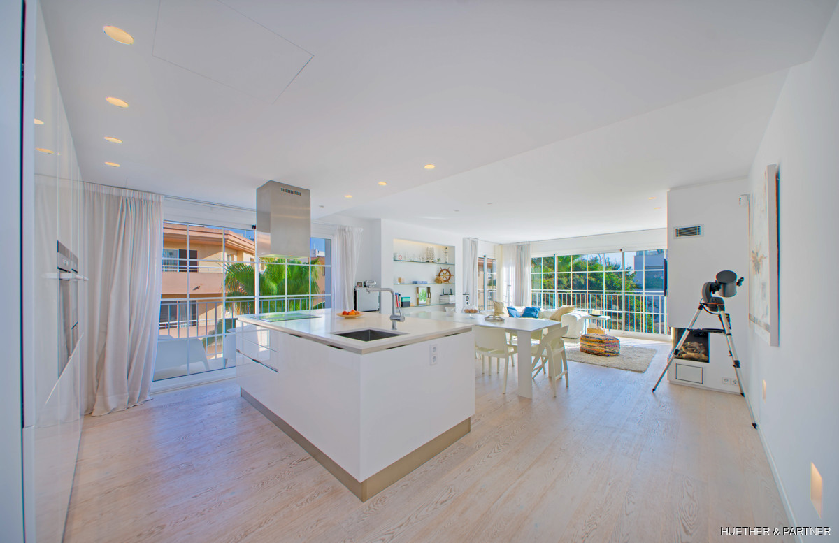Dieses moderne Penthouse in Porto Cristo bietet luxuriöse Annehmlichkeiten und ein lichtdurchflutetes Ambiente. Die Wohnung verfügt über eine voll ausgestattete Venetta Cucine Küche mit Siemens-Geräten und einem stilvollen Wohnbereich mit Gaskamin. Von der Küche aus gelangt man auf einen Balkon, während eine Wendeltreppe zur privaten Dachterrasse führt. Das Hauptschlafzimmer beeindruckt mit einem offenen Badezimmer, freistehender Wanne und Einbauschrank.