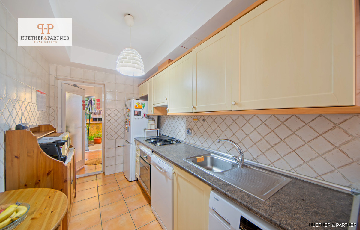 Das Schlafzimmer, ruhig zur Rückseite gelegen, ist mit einem praktischen Einbauschrank ausgestattet. Die voll ausgestattete Einbauküche ist komplett möbliert und bietet alle notwendigen Elektrogeräte. Ein separater Wirtschaftsraum bietet Platz für eine Waschmaschine und zusätzlichen Stauraum. Der kleine Hinterhof eignet sich ideal zum Trocknen von Wäsche oder als zusätzlicher Stauraum. Ein privater PKW-Stellplatz direkt vor der Wohnung rundet das Angebot ab.