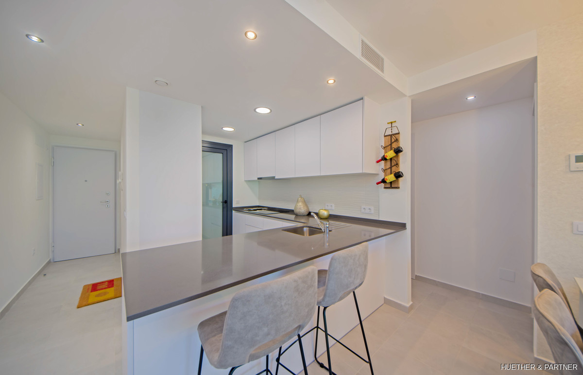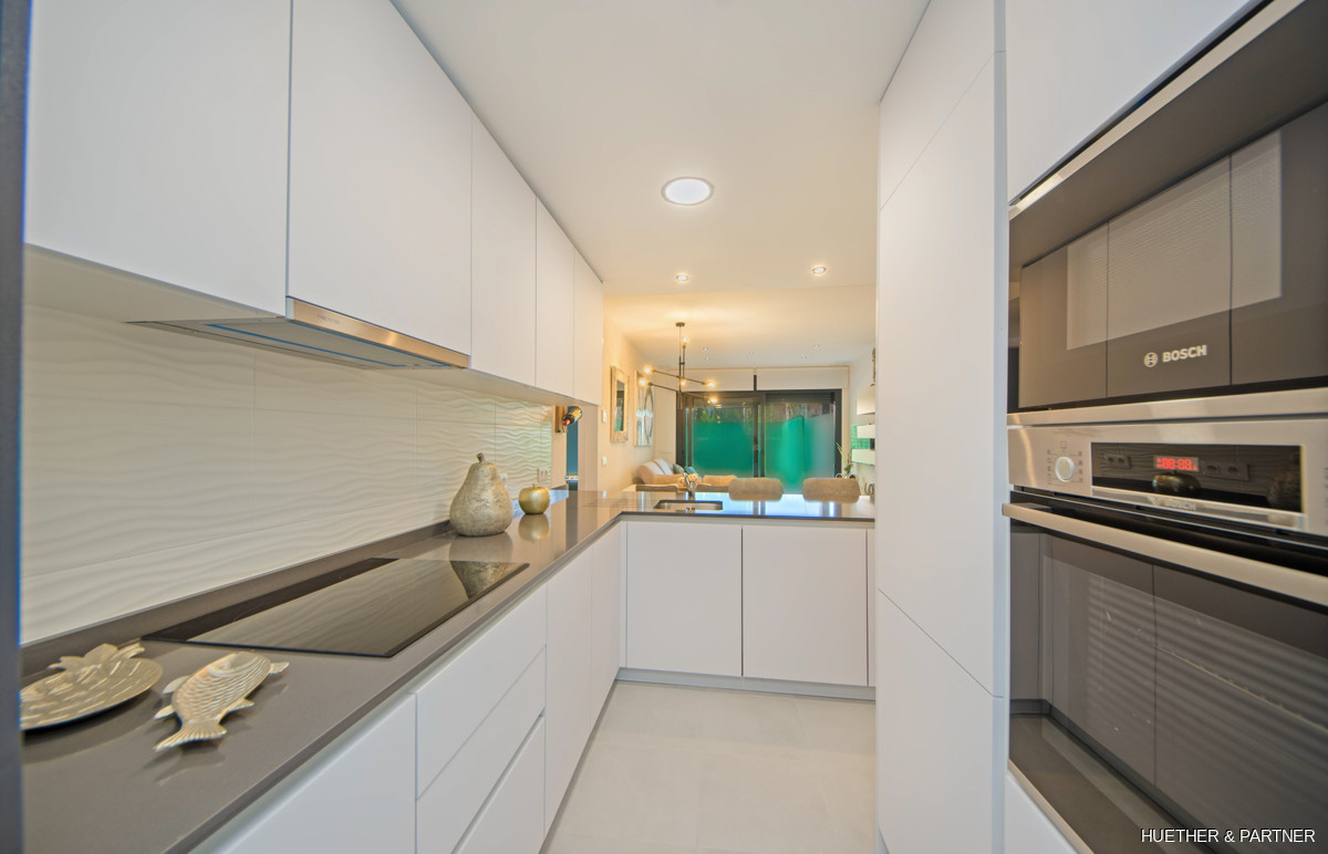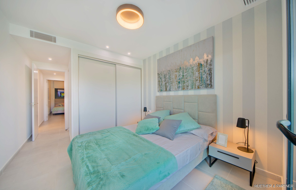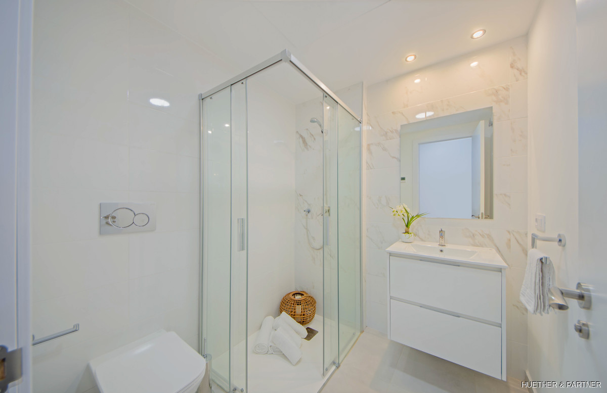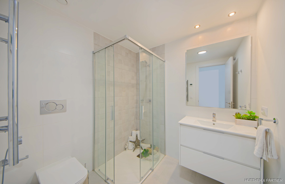Diese luxuriöse Neubauwohnung in einer Designer-Wohnanlage auf Mallorca bietet zwei Schlafzimmer und zwei Bäder. Sie ist mit einer voll ausgestatteten Küche, einer Klimaanlage (warm/kalt) und Steinzeugfliesen ausgestattet. Die Badezimmer verfügen über elektrische Fußbodenheizung und moderne Badmöbel. Die Wohnung hat einen direkten Zugang zur großzügigen Dachterrasse und bietet einen privaten Tiefgaragenstellplatz.
