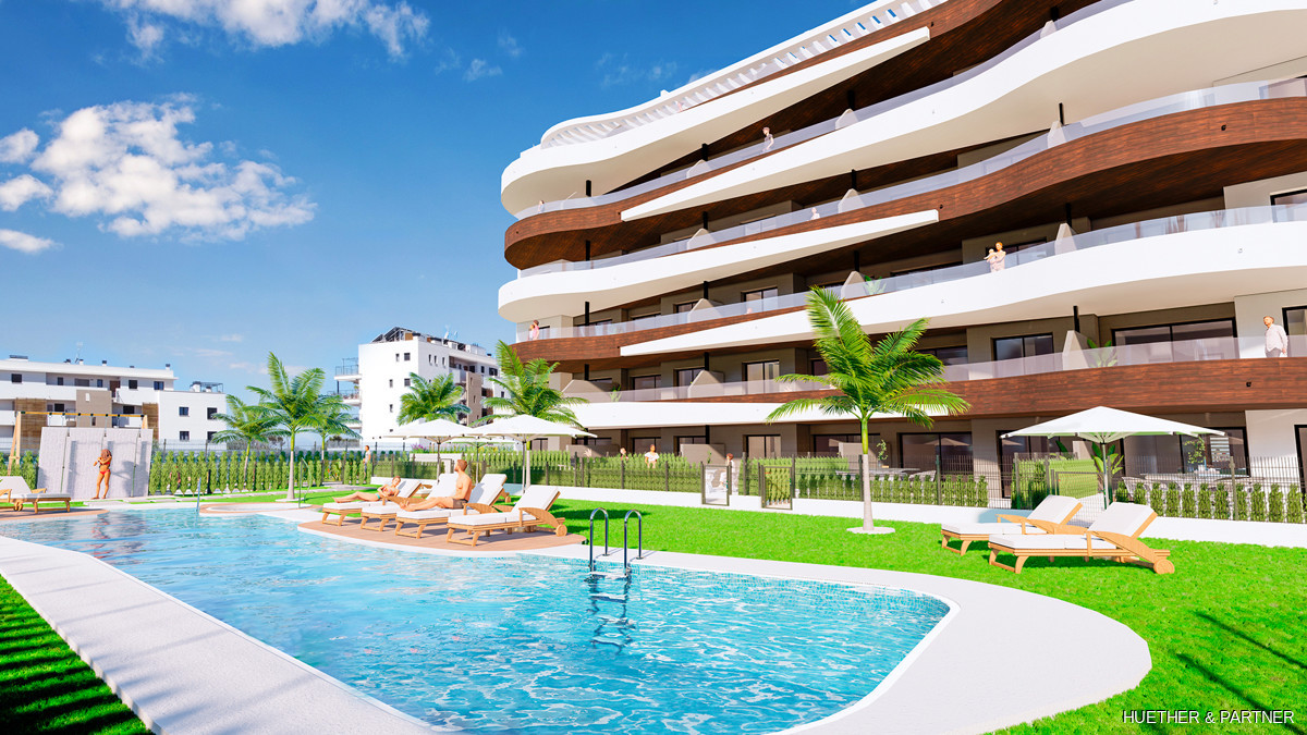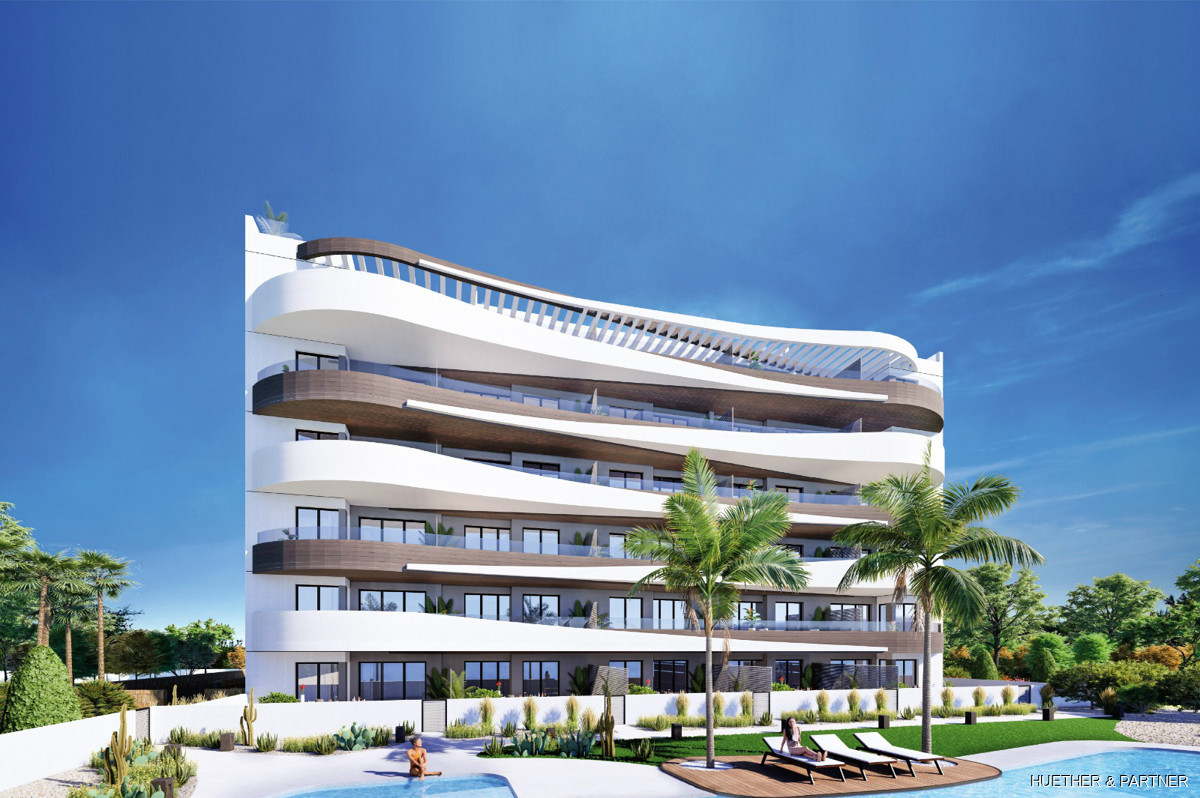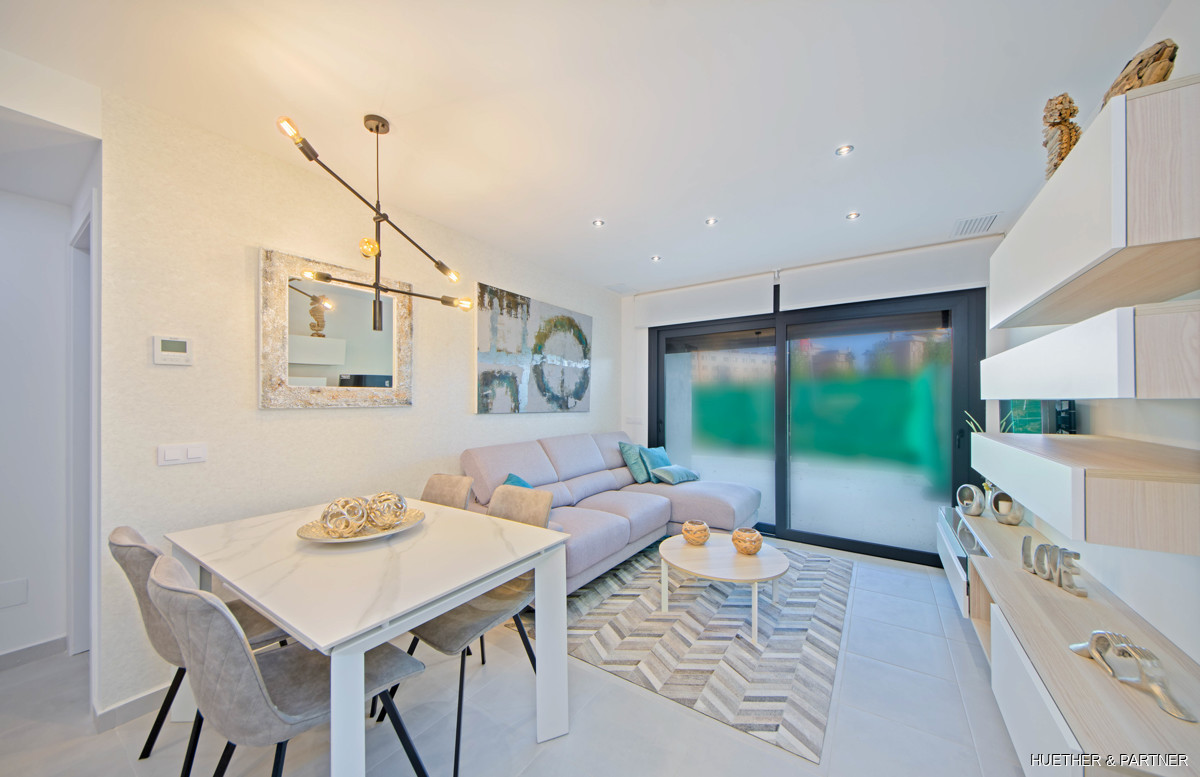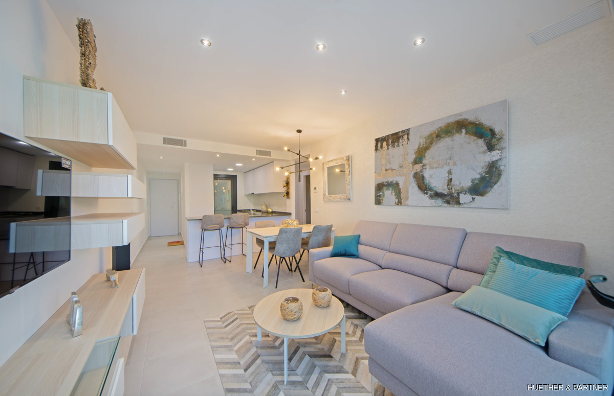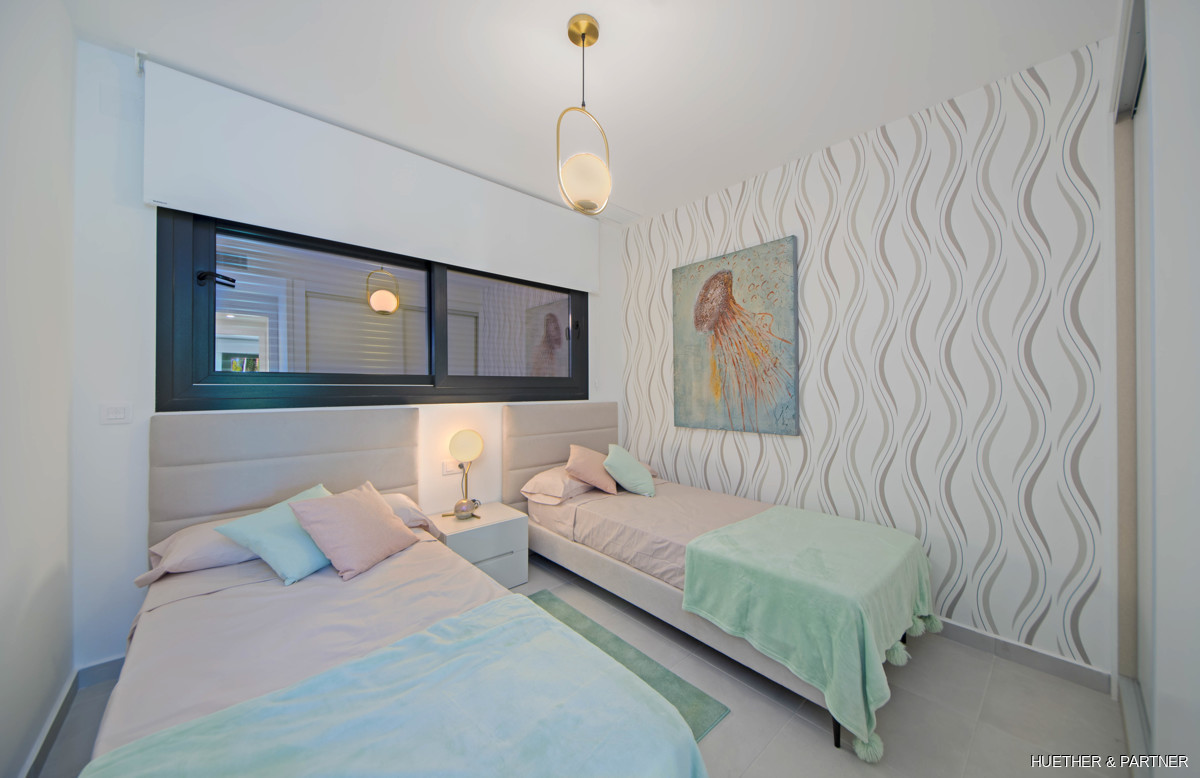 Diese luxuriöse Neubauwohnung in einer Designer-Wohnanlage auf Mallorca bietet zwei Schlafzimmer und zwei Bäder. Sie ist mit einer voll ausgestatteten Küche, einer Klimaanlage (warm/kalt) und Steinzeugfliesen ausgestattet. Die Badezimmer verfügen über elektrische Fußbodenheizung und moderne Badmöbel. Die Wohnung hat einen direkten Zugang zur großzügigen Dachterrasse und bietet einen privaten Tiefgaragenstellplatz.