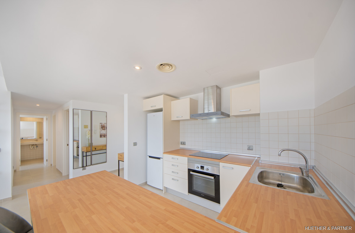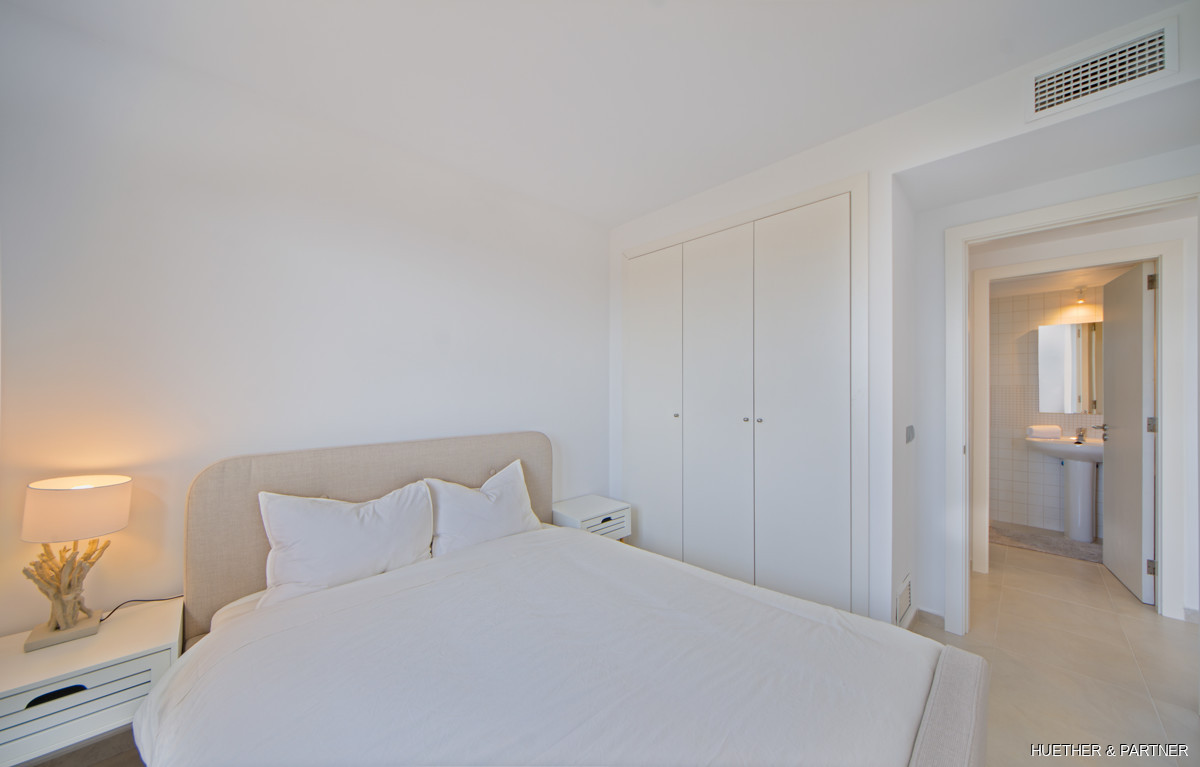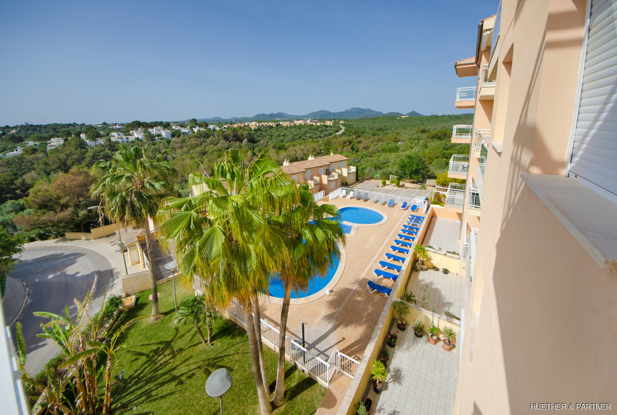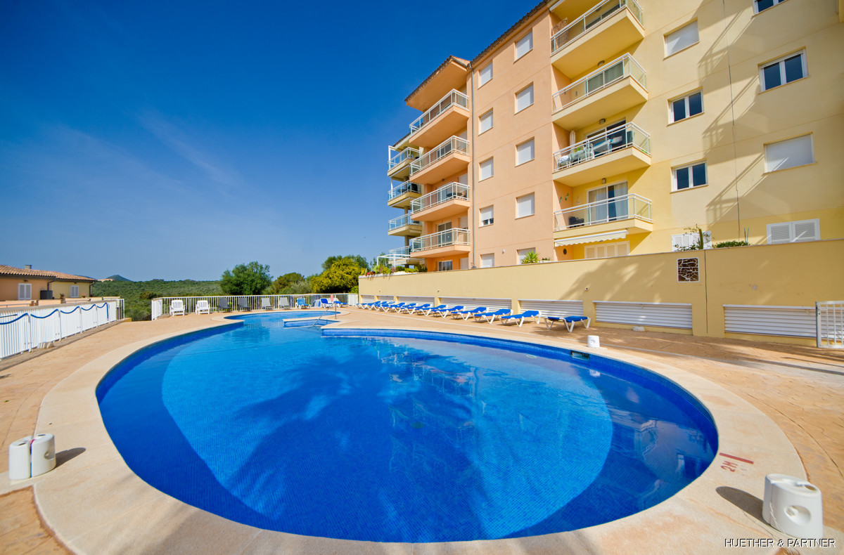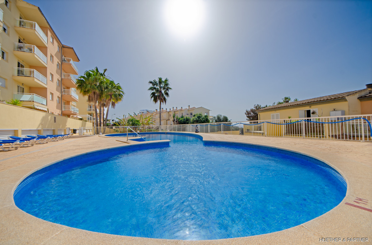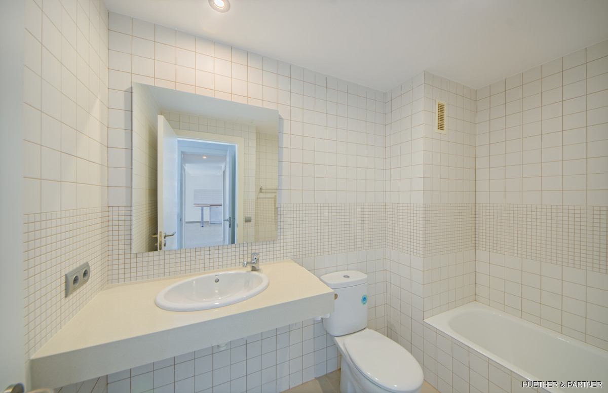 Zur weiteren Ausstattung gehören Aluminiumfensterläden und -türen, ein Tiefgaragenstellplatz und ein Aufzug. Die Wohnung wird unmöbliert angeboten, mit der Option, Möbel zusätzlich zu erwerben. Die Klimatisierung ist vorbereitet, jedoch noch nicht angeschlossen. Die Gemeinschaftsanlage ist nicht von außen begehbar und bietet einen Gemeinschaftspool.